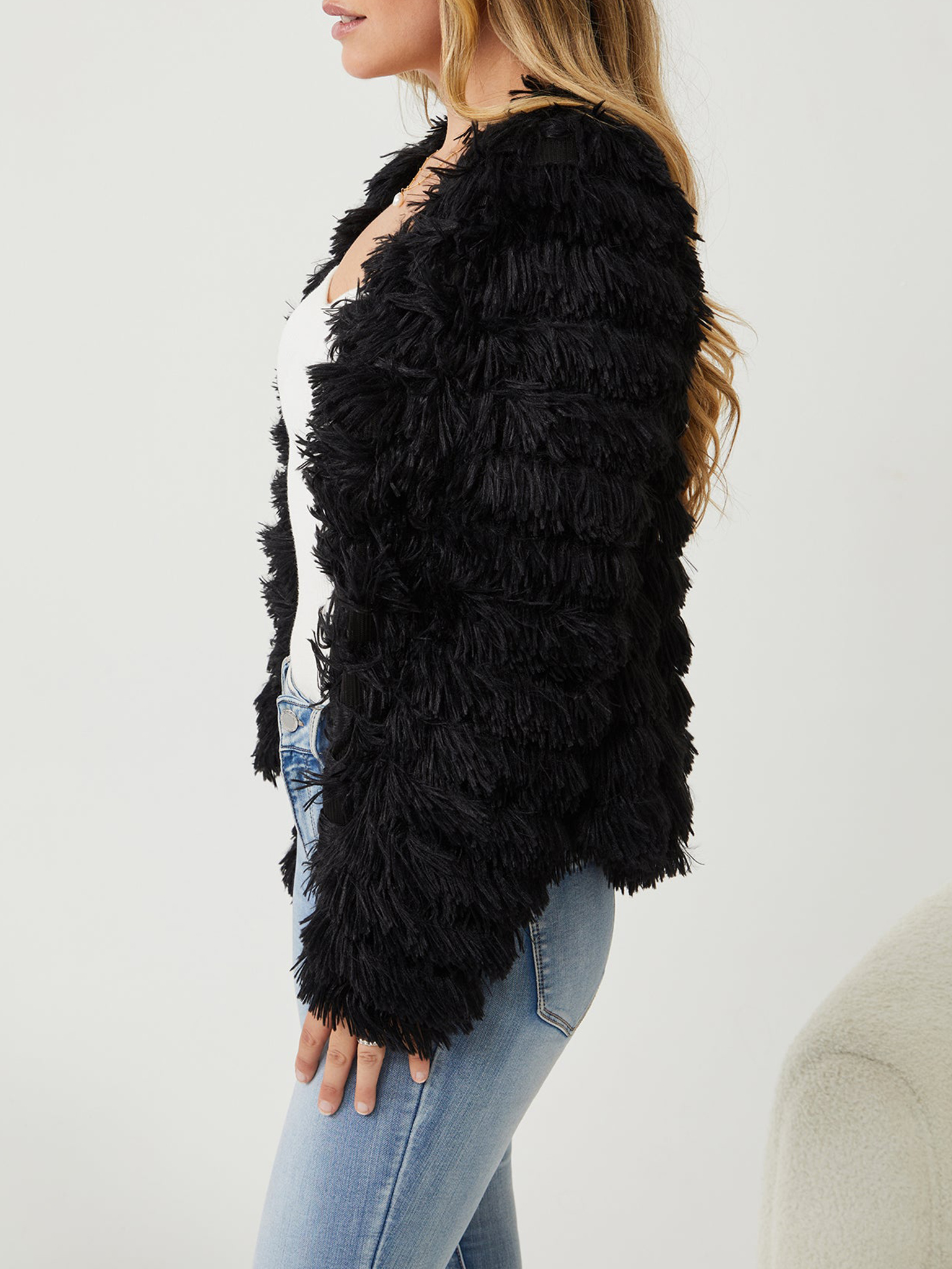 - Key Features: Long sleeves. Open front. Fluffy fabric. Easy wear. Fringe material. Lined. Soft feel. No pockets. Hidden clasp on inside front.