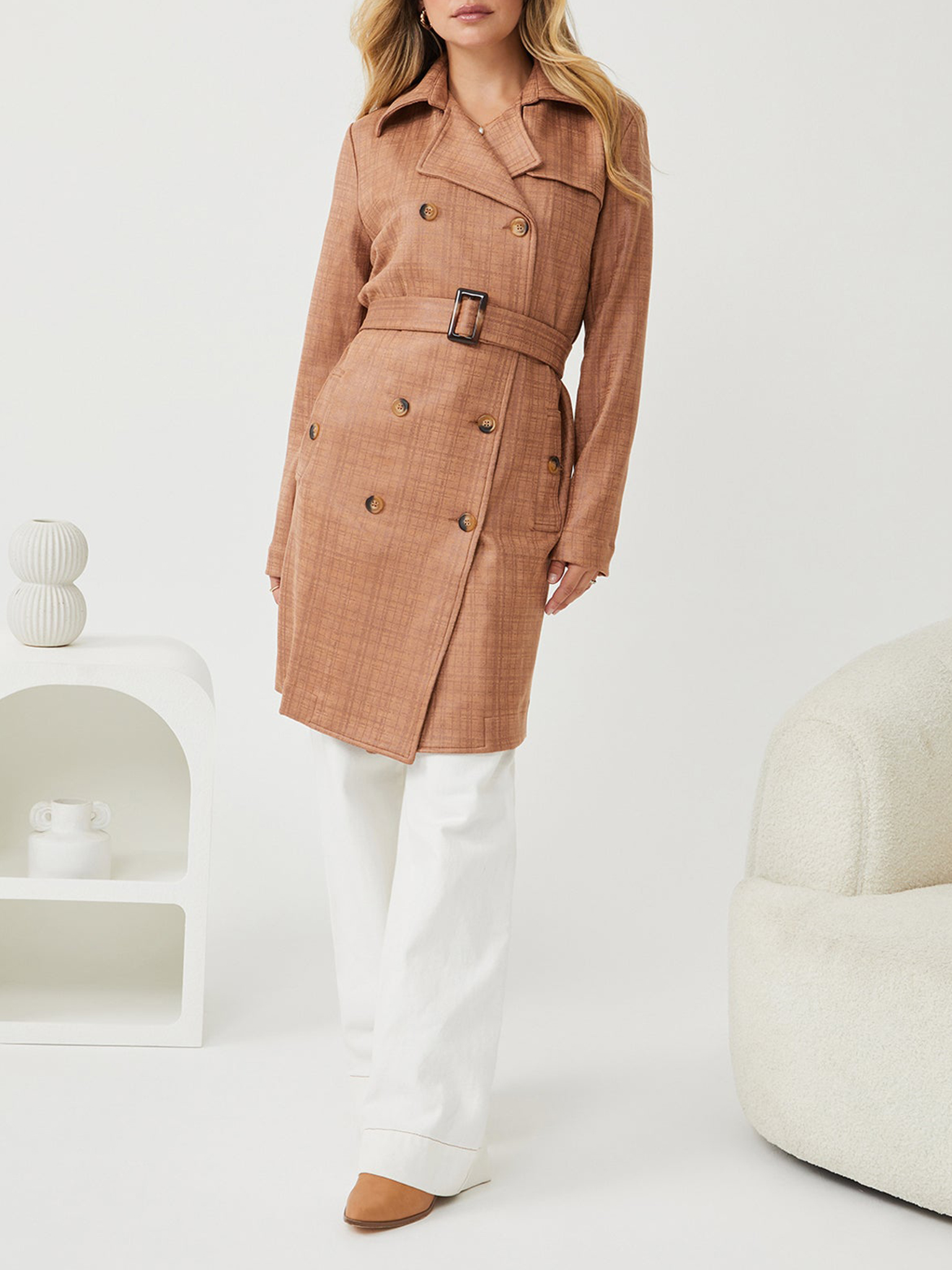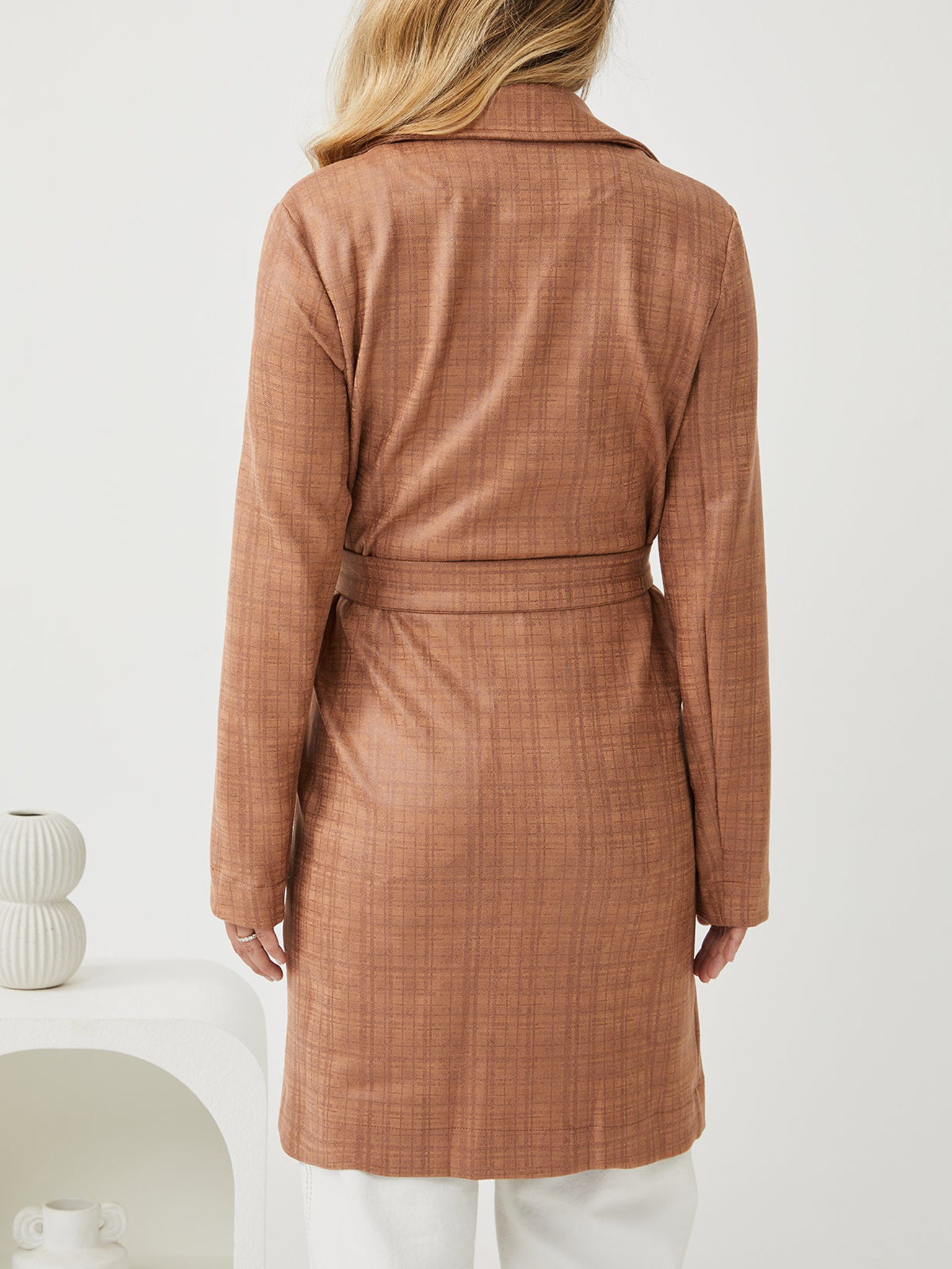 - Key Features: Semi oversized lapel collar. Long sleeves. Buttons in the middle. Fabric belt. Side pockets. Long length hem.