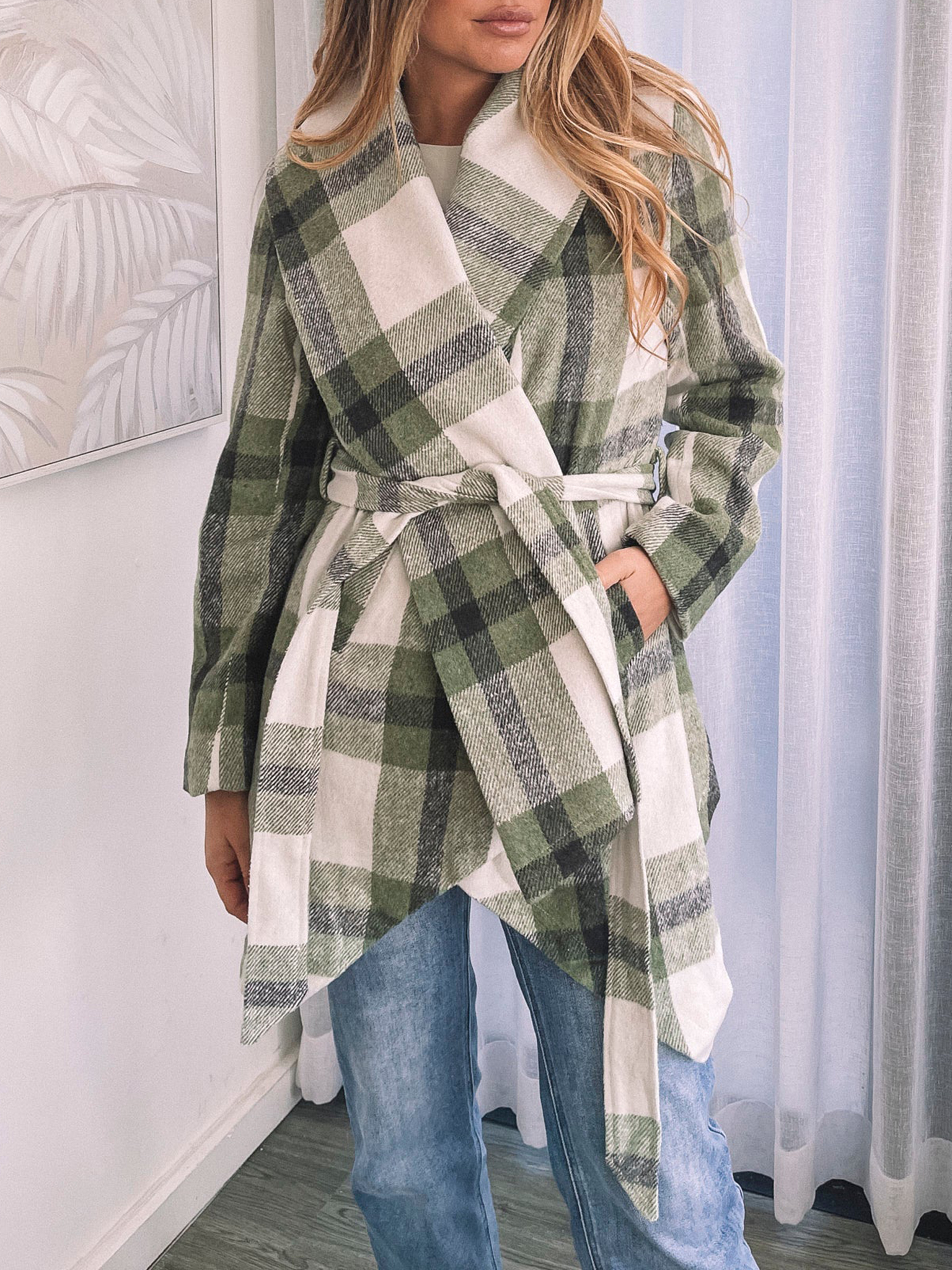 Jacket comes in a check print in shades of green. A harmonious blend of structure and casual ease, this outerwear offers a dynamic edge to any wardrobe with its flat collar, long sleeves and waist tie. Combine this with a comfy cami and skinny pants!